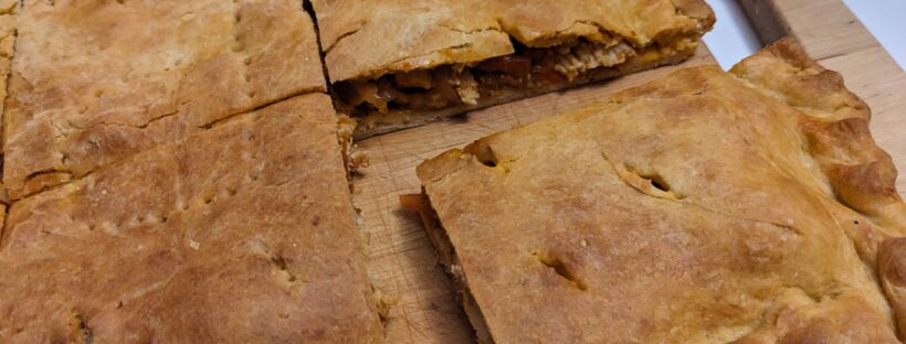 This might not be the usual empanada that I’m used to but it is a delicious and fairly easy to make pie from the Galician region of Spain. Smoked paprika and slow cooked onions give the pie an earthy and soft flavor that makes it easy to eat endlessly. This is a great dish for a party also because it’s easy to make a lot at once and it’s relatively mess free to eat so this could be a great appetizer or standing dinner. It’s apparently traditional to put the letter of whatever is in the pie on top so mine has a ‘P’ for pollo but feel free to try other fillings!
