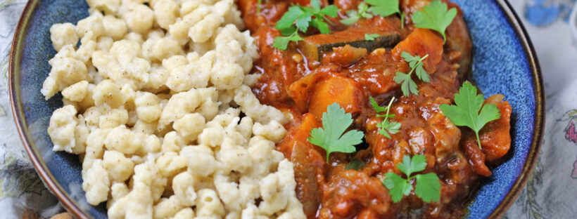 I find this goulash to be completely addicting. Something about stewing chicken in tomatoes makes them irresistible to me (see also : Chicken Vindaloo). This is a pretty easy to make, it requires a small amount of up front work for browning the chicken but after that it basically cooks itself and you simply come back and collect it at the end. It’s served by itself sometimes but more likely on top of spaetzle (egg noodles), pasta, rice, mashed potatoes or even bread.
