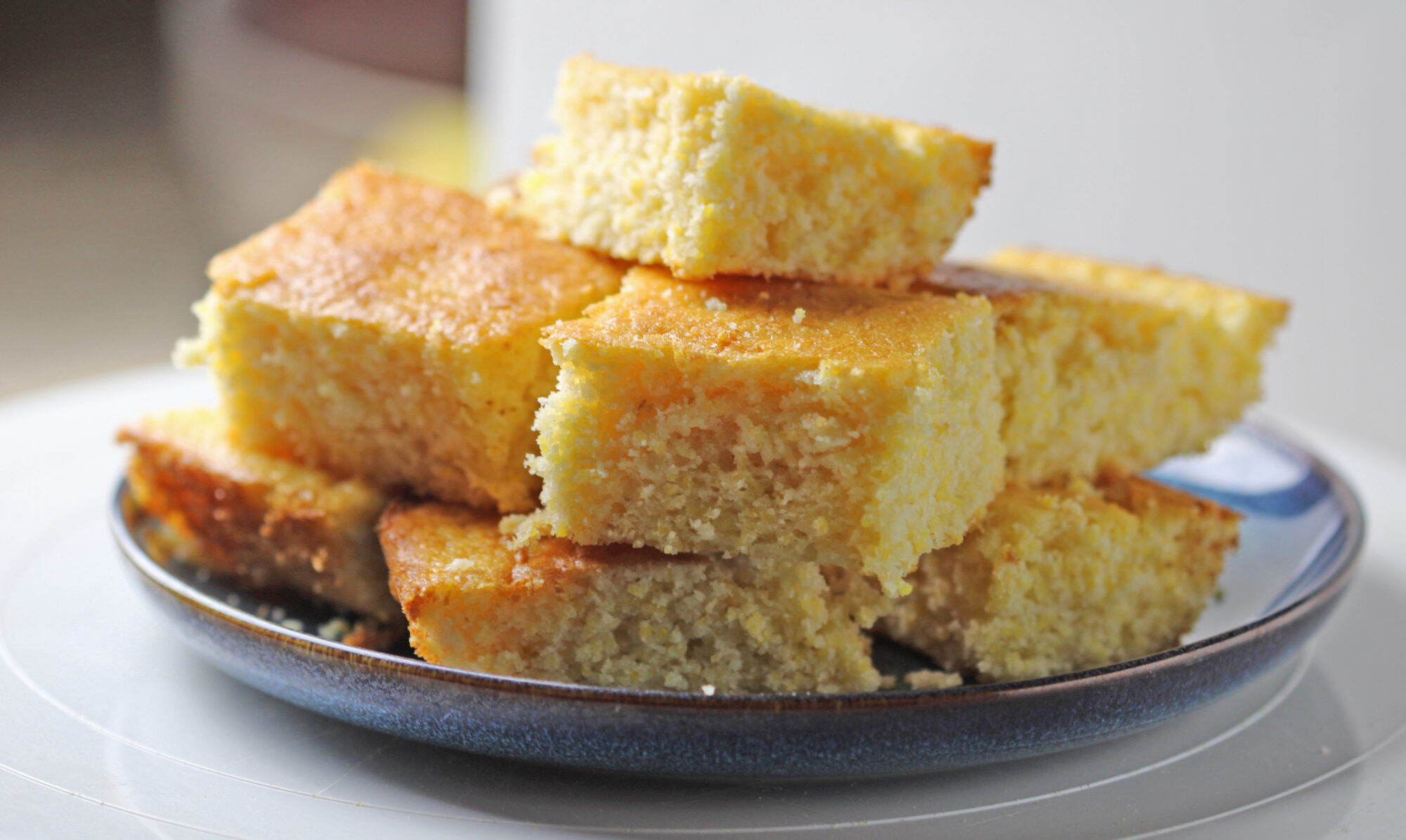 A simple staple that goes with all sorts of foods, this cornbread like most others, whips up in about 5 minutes of work and tastes moist and fluffy and delicious. Perfect with chili, soups, stews, or even as a quick breakfast with cream or jam.