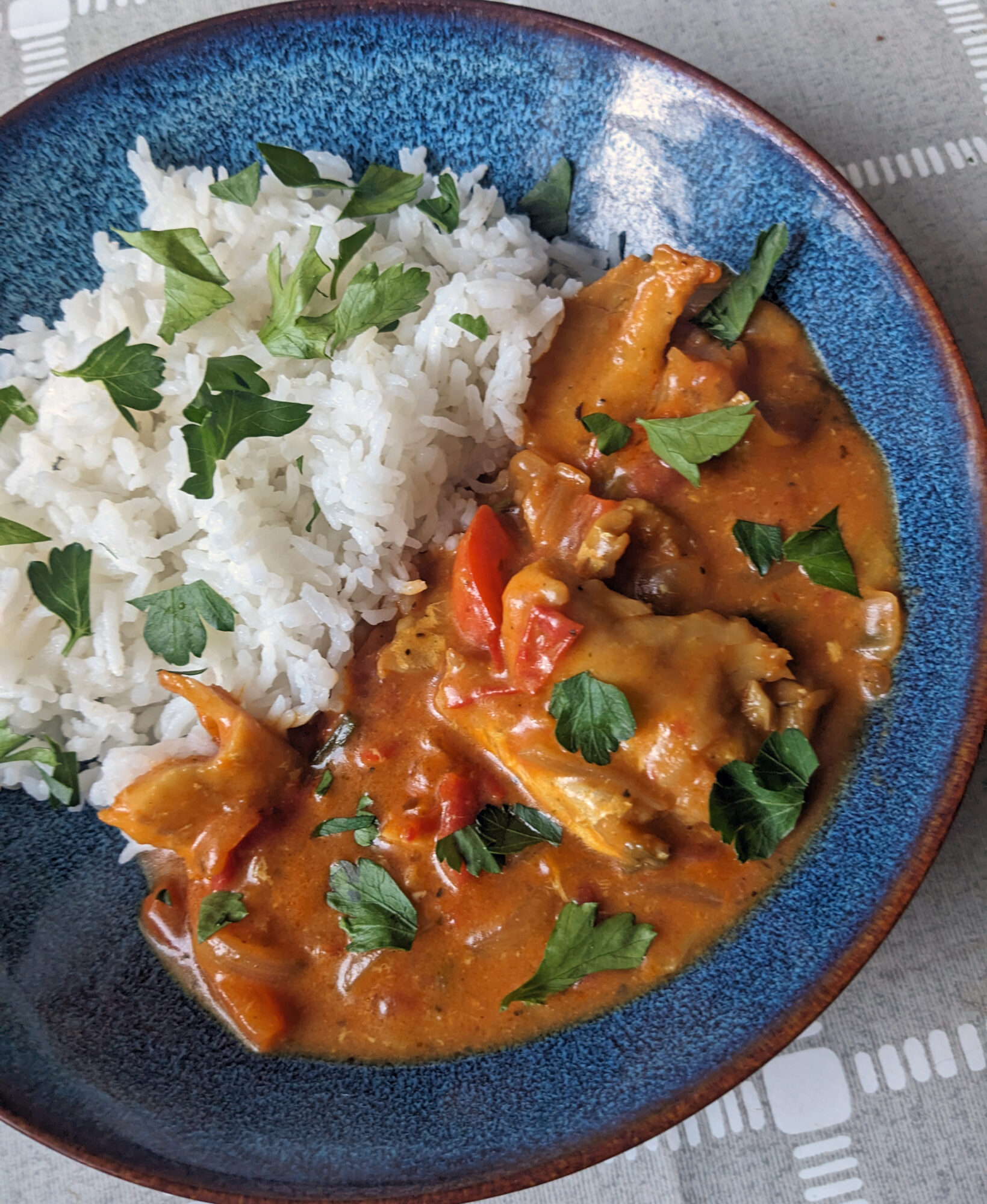 This is a really quick and easy fish stew that leans on the flavors of coconut milk, tomatoes, and lime to create a wonderfully creamy sauce that pairs well with most white fish. This is made in one pan, it’s gluten free, and you can easily use any type of mild white fish or shell fish you have available making it a great week night meal. I’d actually like to try this again with some shrimp because I think it would be even better. You can eat this alone like a soup or with rice for a more of a hearty meal.