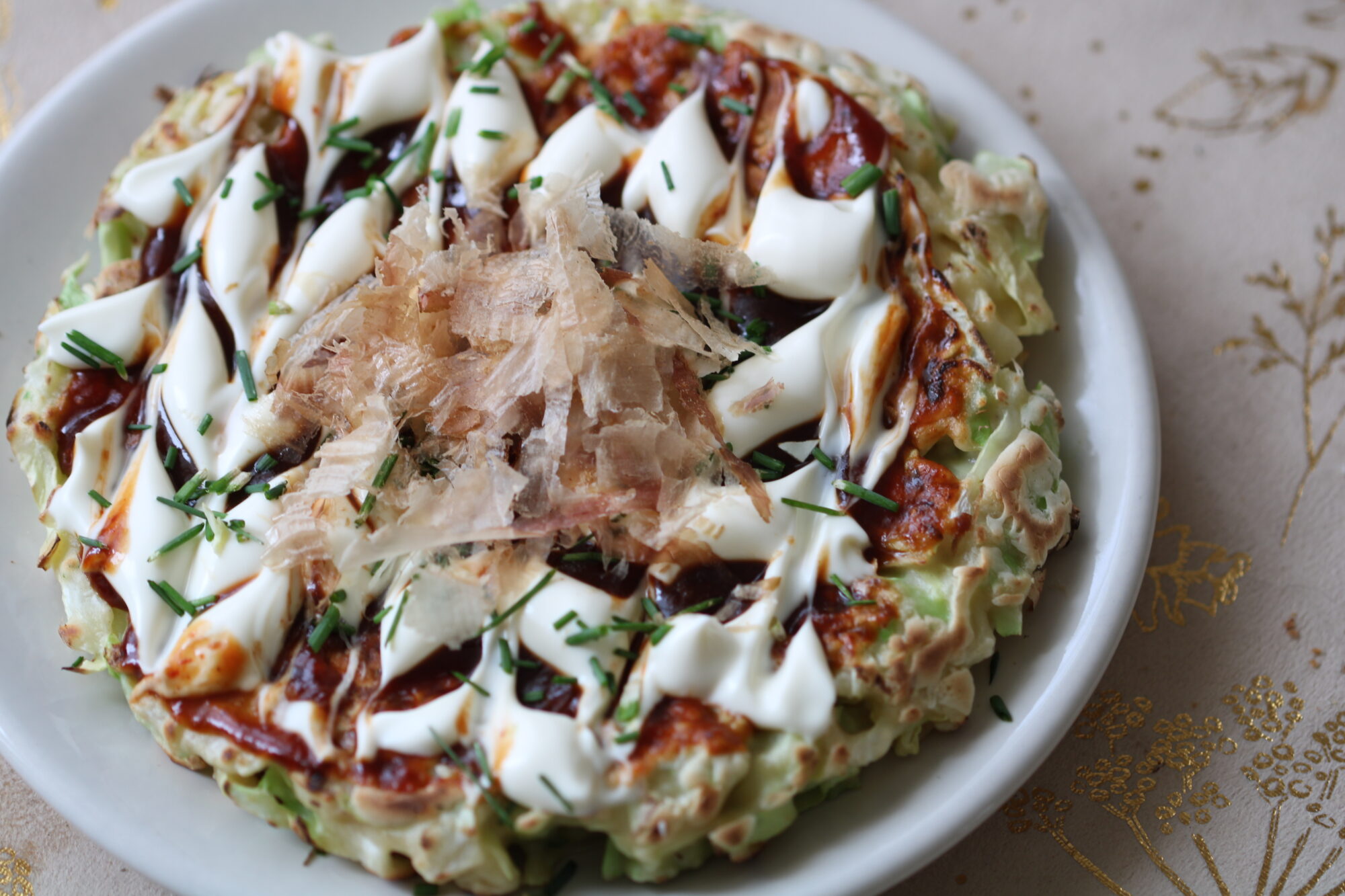 Basically okonomiyaki are like a savory Japanese pancake that is shoved with whatever you like (the word okonomiyaki is literally “what you want”). This is a pretty basic one with just some dried tuna flakes and cabbage but you can pretty much put in anything you want from blue cheese to fish eggs to ground bison – whatever you have laying around. You can pick up the Japanese ingredients in a specialty Asian store or on Amazon.