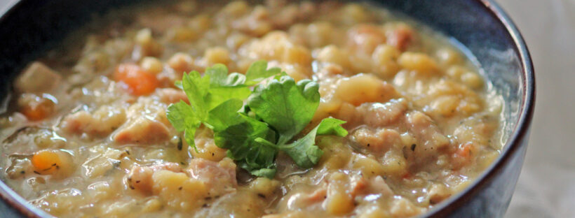 Hearty and comforting split pea soup is generally made with smoked ham but I found some smoked chicken to use instead and now it’s one of my favorite fall/winter recipes. This soup is thick and rich with a little bit of bite and spice. Great with a good rye or black bread and it even freezes well for cold nights when you don’t feel like cooking but want something to warm you up.